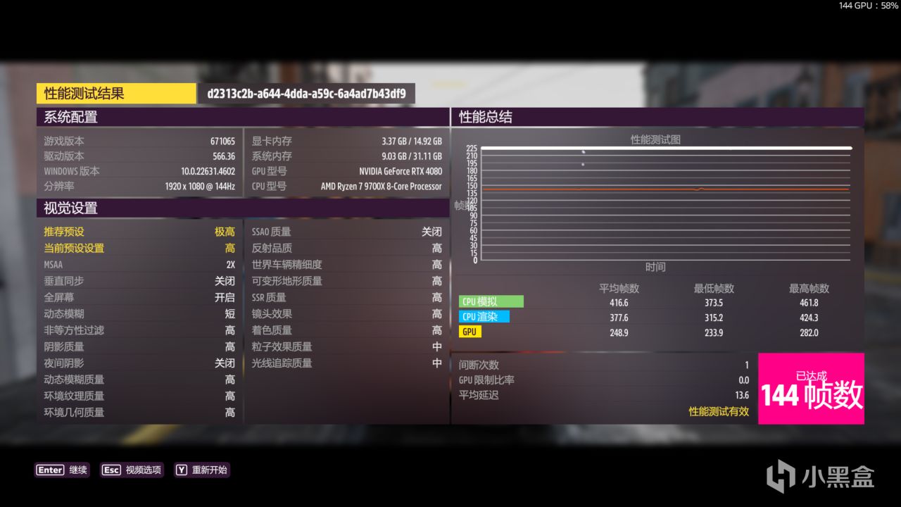 极限竞速地平线5,1080P高画质,GPU平均帧数248.9、最低帧233.9,CPU模拟平均帧数416.6、最低帧373.5。
