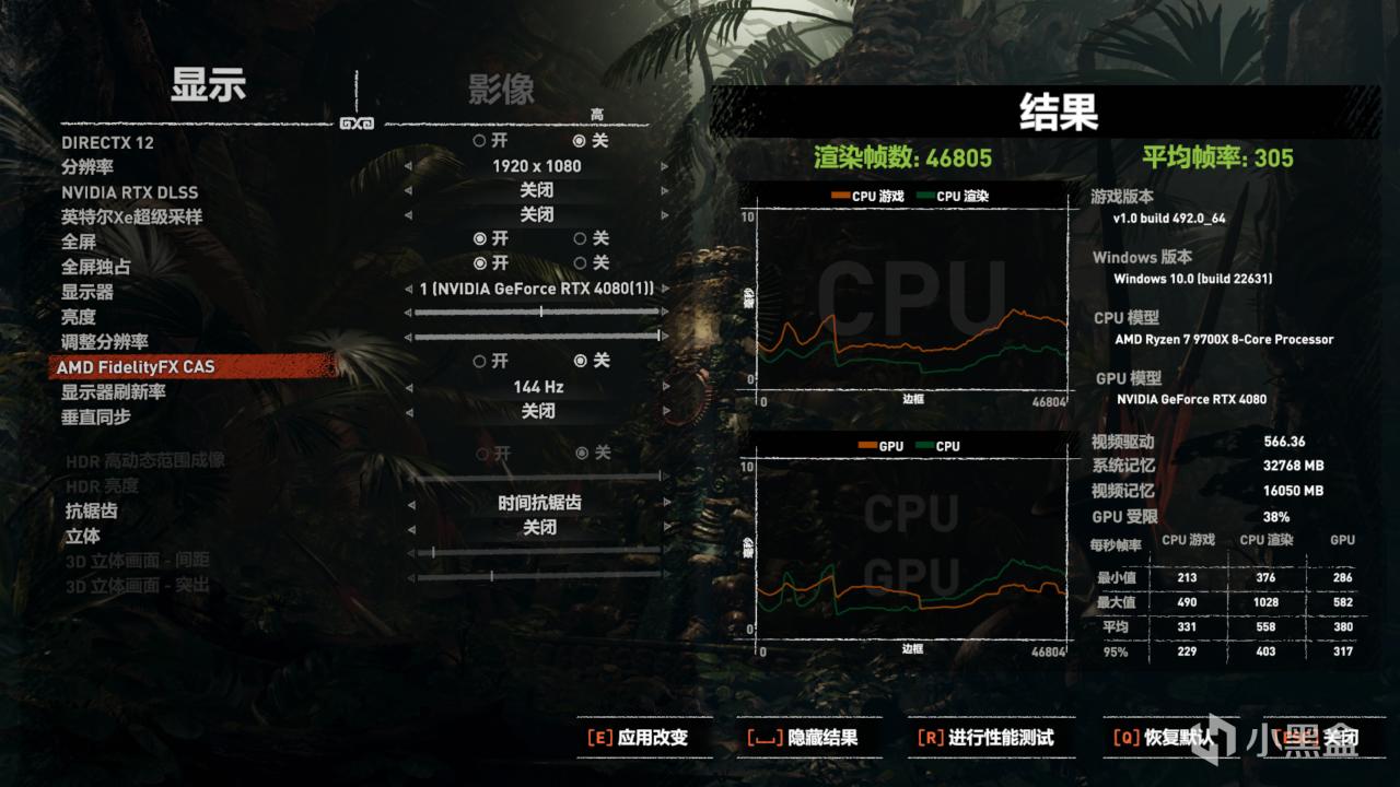 古墓丽影暗影,1080P高画质,关闭DLSS和超采,DX12模式下,平均帧305,最低帧286,真够稳的,此时,CPU的性能不足以发挥出4080的性能了,测试结果显示GPU受限。
