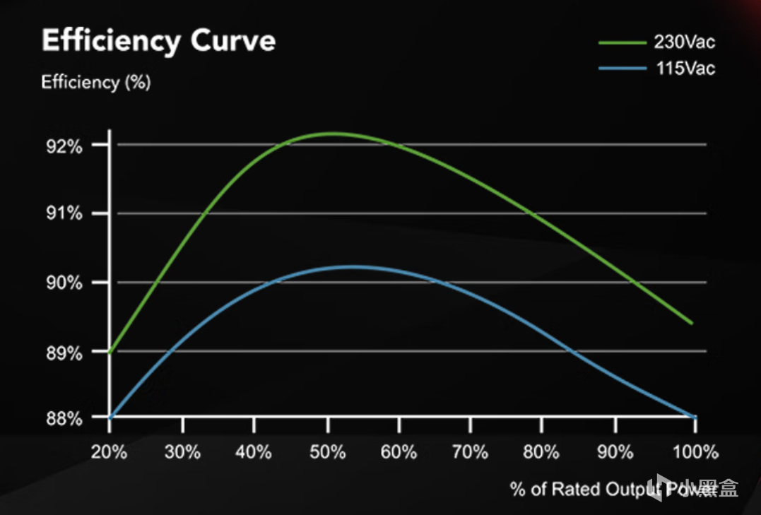 而艾湃电竞GTI在负载为40%~60%之间,工作效率最高、电源整体的能量转换效率很好,可以达到92%的白金级别,而日常也有不低于89%的转换效率,用起来也更稳妥一些。