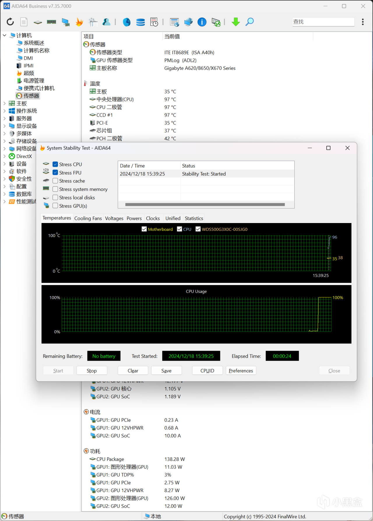 室温30摄氏度,烤鸡140W功耗的时候,CPU温度在95左右,能接受能接受……待我再找个合适的散热器。