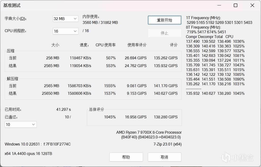 内存在EXPO6000C28的时候,整机的7-ZIP基准测试得分如上,138.280,约为我家14900K整机的64%。