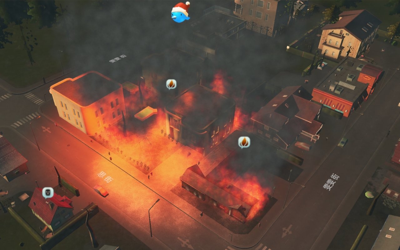 图为火灾,火灾可能会蔓延至相邻建筑,需要建设消防局以尽快扑灭大火。(游戏中还会出现森林火灾,蔓延迅速,可以建立消防直升机站及时发现森林火情并扑灭)