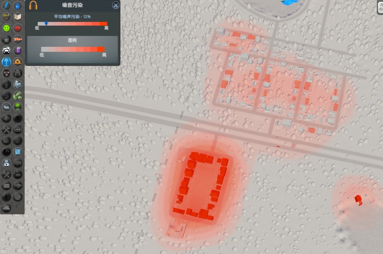 如图是噪声污染导致的居民生病,此时可以在附近修建医院治疗病人。(喝污染水导致的生病似乎没有标识,通常表现为大面积出现死亡)