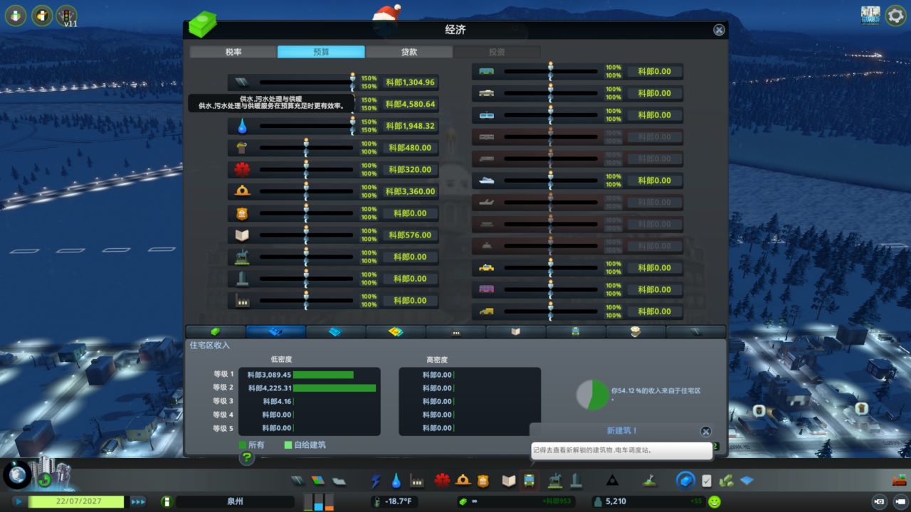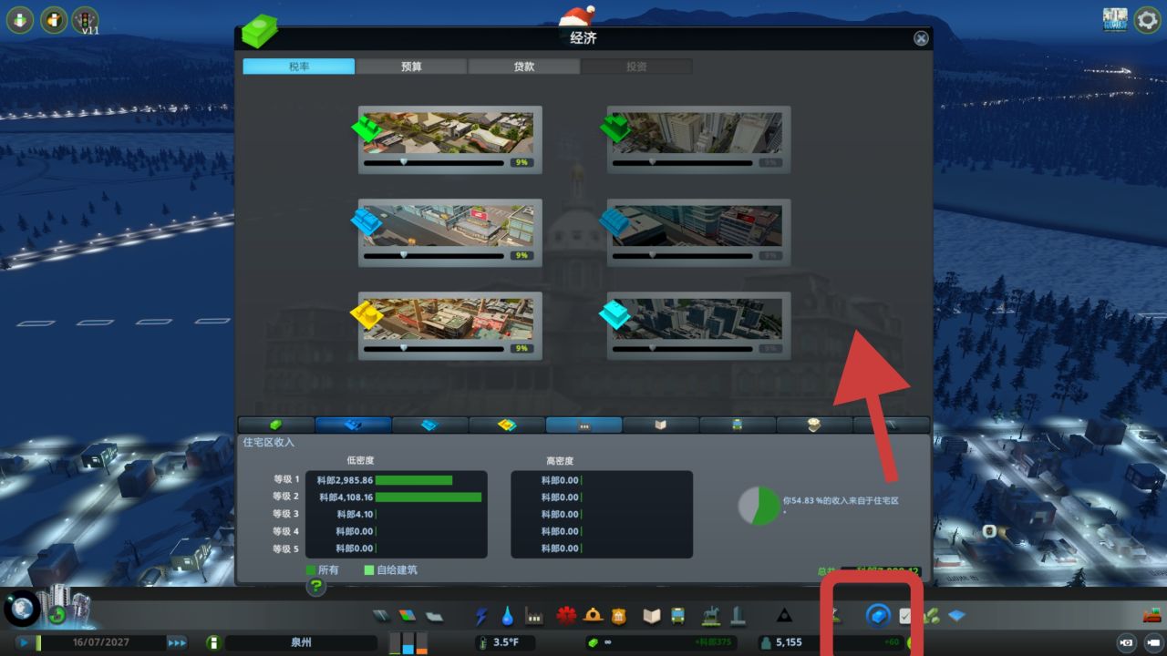 经济面板第二项为预算,预算越高,建筑效率越高,派出的工作车辆(如果能)越多,最高150%,最低50%,上下两个条分别控制白天和夜晚的预算
