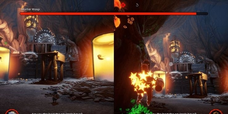 大炮黄蜂也是一个非常简单的大炮黄蜂。它会一直在空中盘旋,并时不时发射绿色的炮弹进行攻击。和上一场盾牌黄蜂的战斗一样,科迪需要先向大炮黄蜂身上发射树液,然后小梅再将其引爆即可。