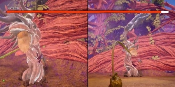 然后小梅将土壤打湿,科迪猛击这里的土壤进入乔伊内部。短暂的过场动画后屏幕上会出现提示,一直按按钮就可以将被感染的部分移动到地面,然后小梅冲上去用镰刀进行攻击即可。