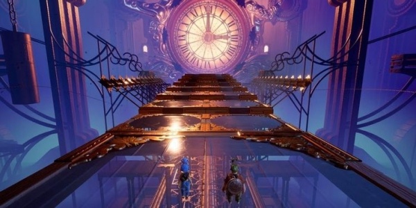 第二阶段比较简单,所有的平台被钟摆摧毁后,两人会掉入一个很深的坑中,此时需要避开从内壁上伸出的齿轮和管道。触发过场动画后此阶段结束。