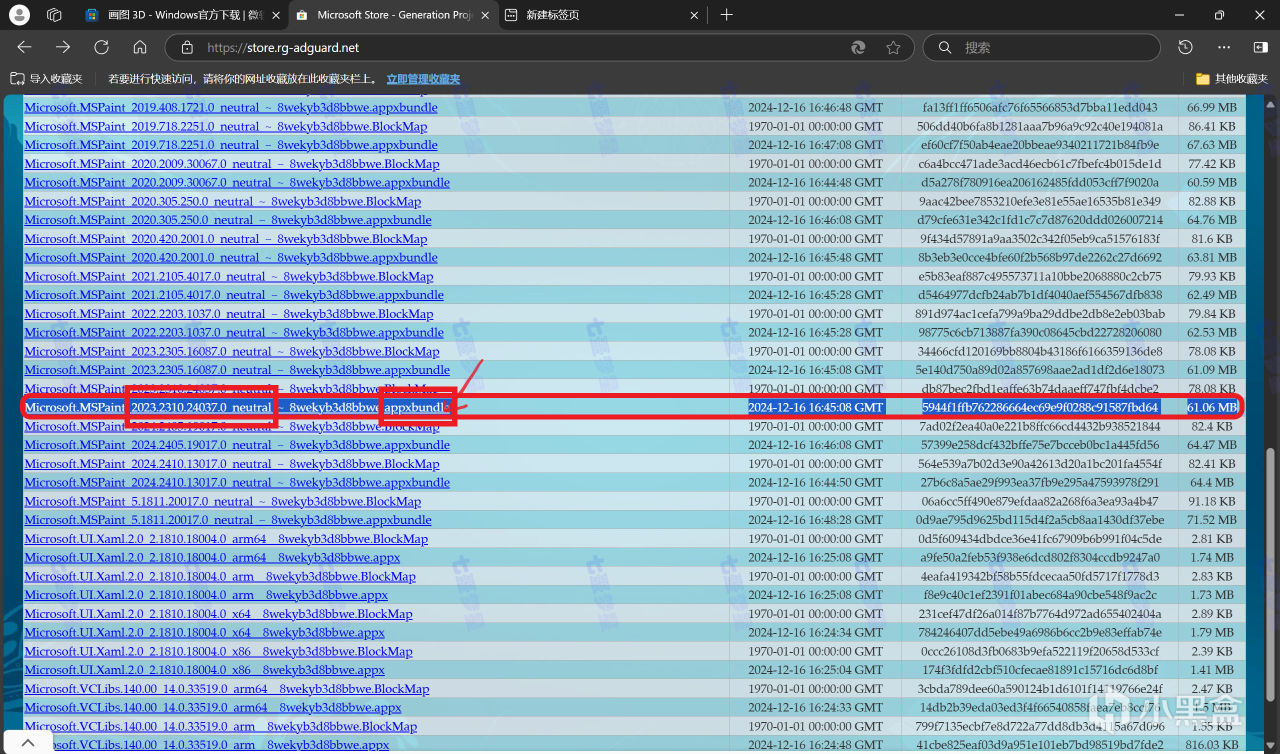 ●在這裏可以看見多個“畫圖3D“的歷史版本安裝包,注意後綴爲(.appxbundle)的爲安裝包