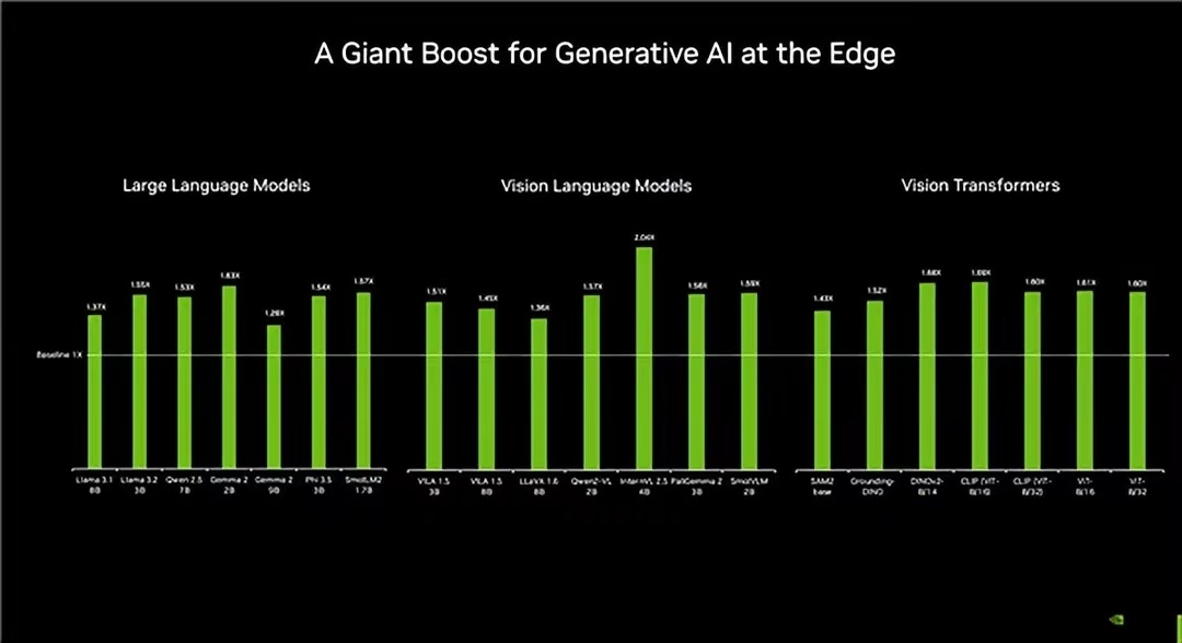 在大语言模型方面,Jetson Orin Nano 的性能提升了 37% 到 63%;在视觉模型领域,性能提升了 36% 到 104%;而在视觉转换器上,性能更是提高了 43% 到 69%。