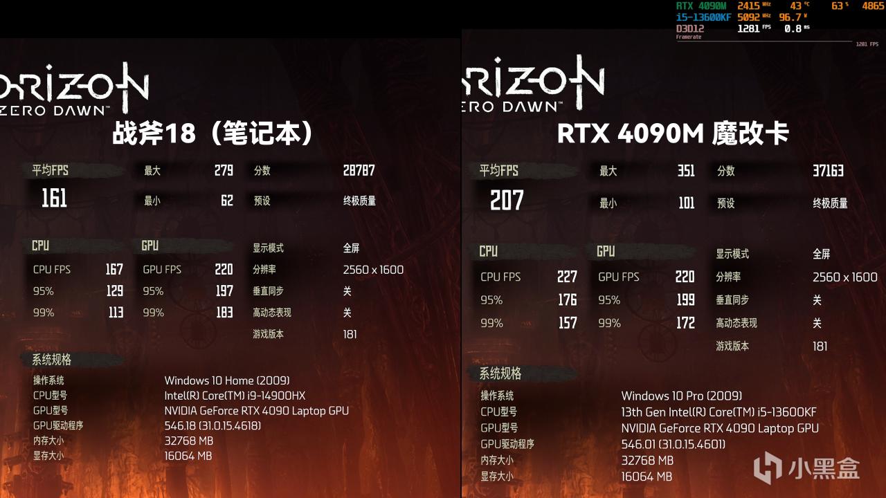 從《地平線零之曙光》這款遊戲當中的測試結果來看,CPU的FPS分數上遠高於筆記本端的,而GPU分數兩者都是差不多的狀態,所以千萬千萬不要有這張魔改的4090M性能還可以的錯覺!所以千萬千萬不要有這張魔改的4090M性能還可以的錯覺!所以千萬千萬不要有這張魔改的4090M性能還可以的錯覺!