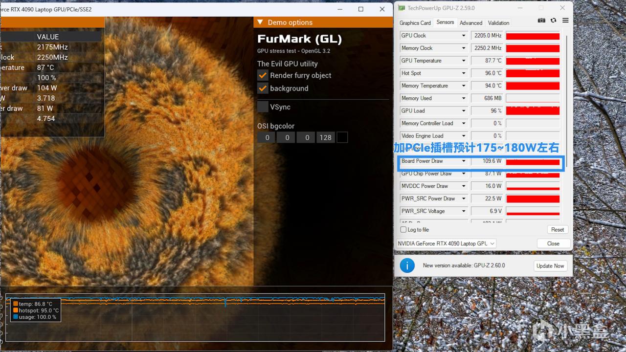 接着,我還跑了一遍甜甜圈烤機測試,15分鐘的烤機測試中,這張魔改的4090M在GPU-Z的軟顯功耗爲100W左右,結合此前的理論測試來看,這個軟顯功耗是並不準確的,應該再加上PCIe插槽的75W供電,預計是跑在175W左右的功耗所以這也是爲什麼這張魔改卡這麼小巧的只給到了雙風扇的原因。