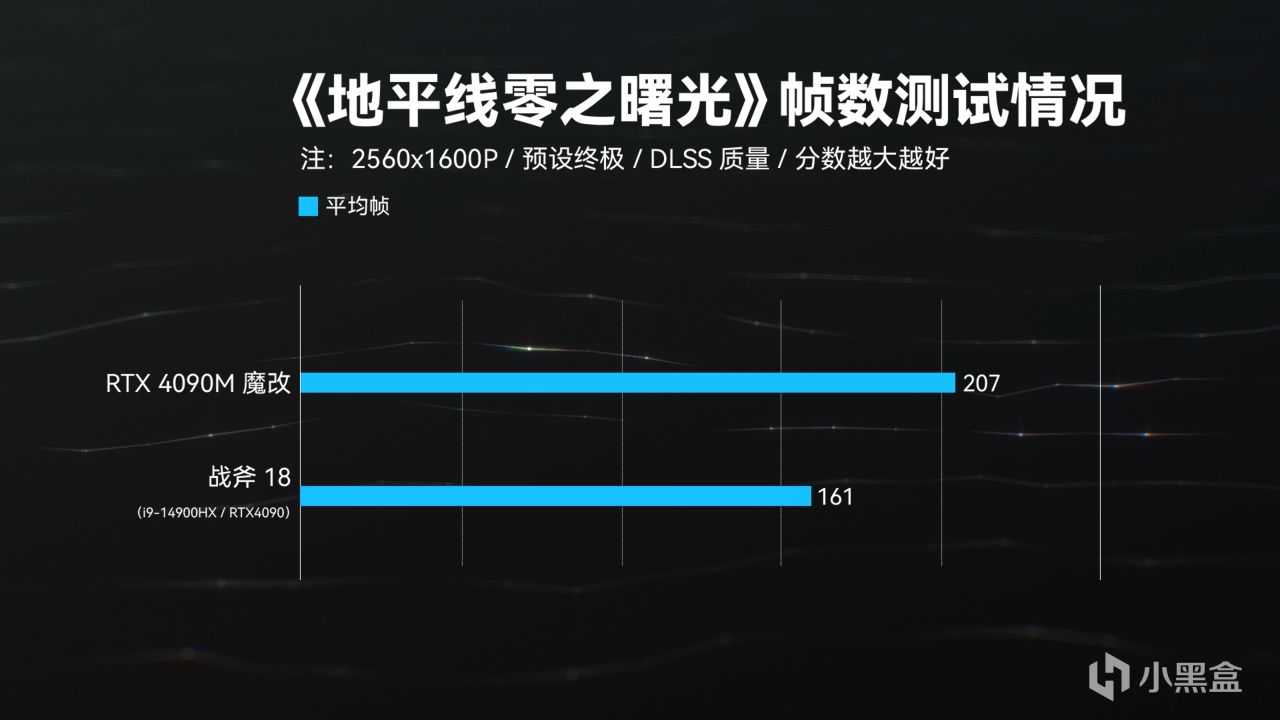 最後一個遊戲是《地平線零之曙光》這款遊戲當中,畫質預設終極,開啓了DLSS質量檔位,也是通過遊戲自帶的基準測試進行測試,可以看到魔改的4090M最終是獲得了207幀的平均幀數,相較於戰斧18的161幀是高出了約爲28%左右。