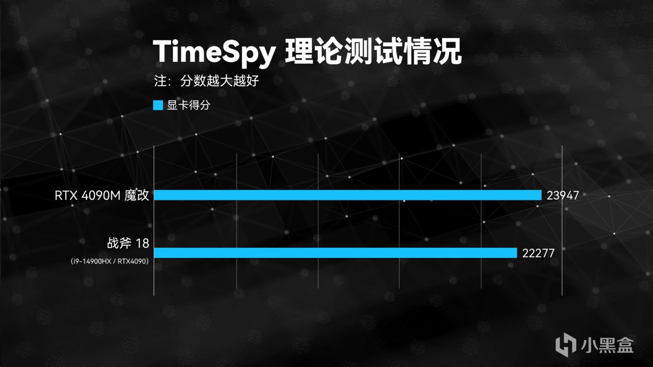 那麼,我們首先來看看這張魔改的RTX 4090M在理論測試中的表現情況吧,在TimeSpy中魔改的4090M最終是獲得了23947的得分,對比此前測試過的戰斧18的22277的得分,差距在7%左右。