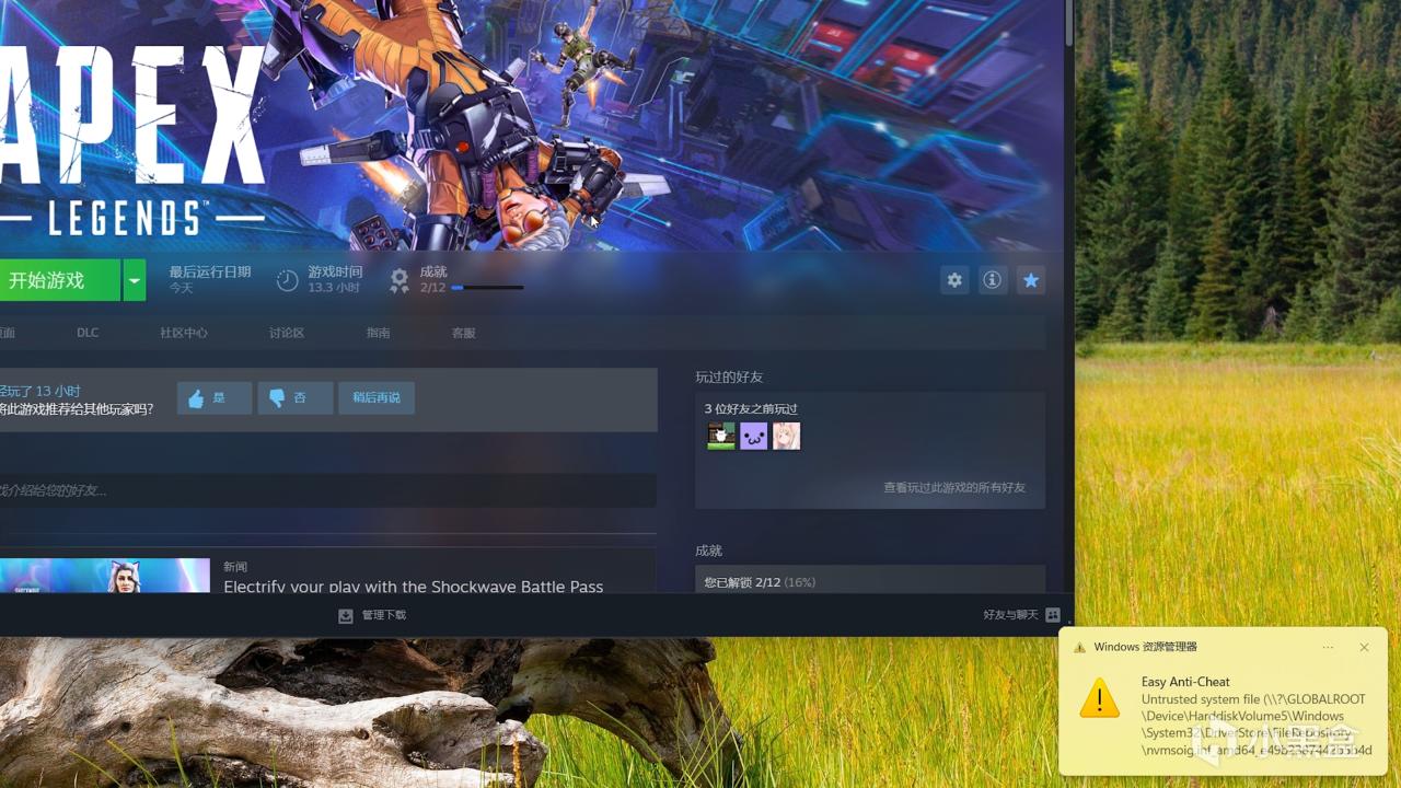 緊接着我又測了另一個網遊《APEX》,很可惜的是啊,遊戲直接就是進不去,小藍熊直接提示不受信任的文件,起初我還以爲是遊戲文件受損,重新安裝了一遍遊戲也是一樣,嘗試網絡上的修復方式,也無法進入遊戲,爲了驗證其他遊戲也是不是這樣,我也測試了一下同樣採用小藍熊防作弊系統的《艾爾登法環》,結果也是和《APEX》一樣,小藍熊直接提示不受信任的文件,進不去遊戲,根據提示找到了該文件,應該是英偉達驅動相關的目錄,這邊也沒有去深究。