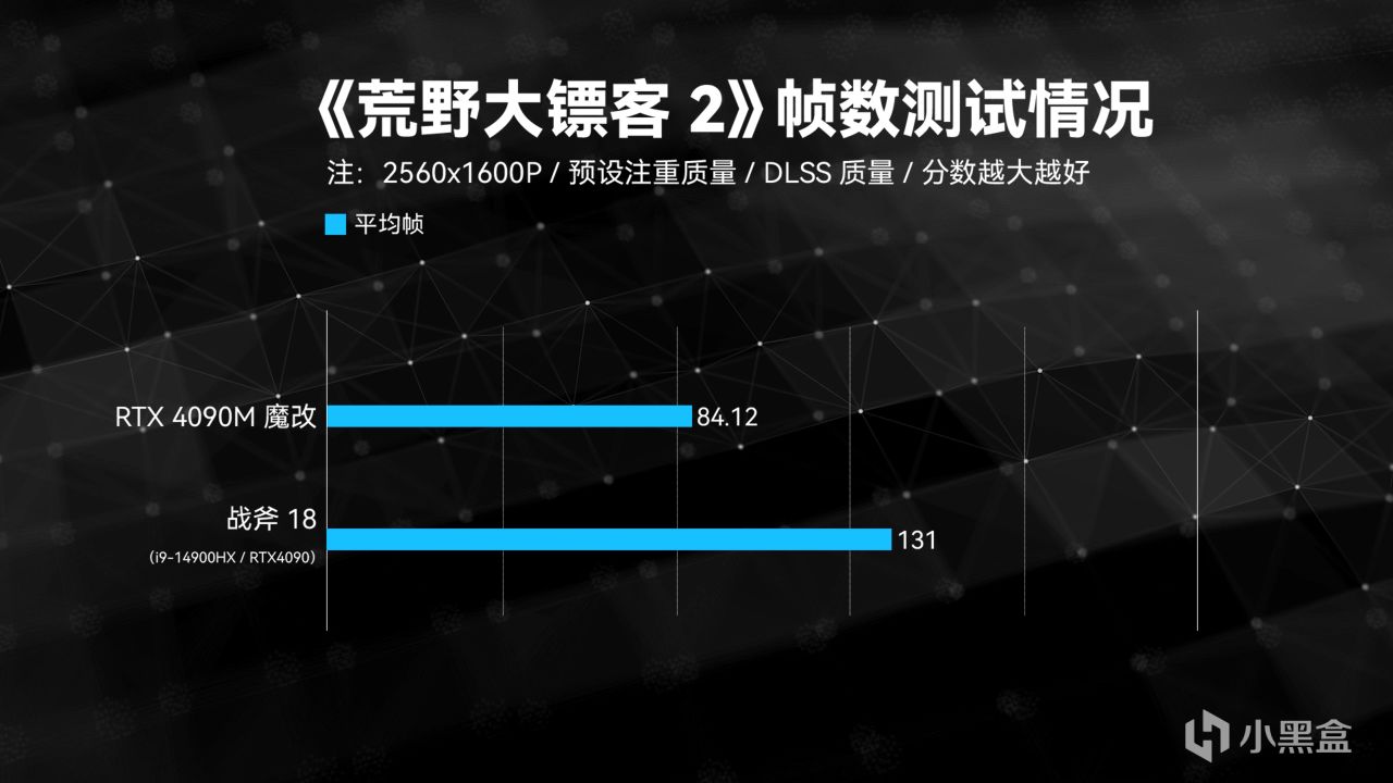 然後是另一款3A遊戲《荒野大鏢客2》中的表現,畫質預設最高,開啓DLSS質量檔位,通過遊戲自帶的基準測試進行測試,可以看到在這款遊戲中,魔改的4090M的平均幀數相當的低,僅有84幀的平均幀,而相較於戰斧18的131幀平幀,低了55%左右。