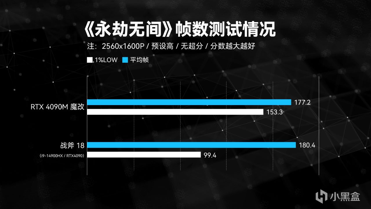 首先是在永劫無間這款遊戲當中,分辨率設置爲和戰斧18一樣2560x1600的分辨率,畫質預設高,最終這張魔改的4090M是獲得了177幀的平均幀,而對比戰斧18你會發現,居然平均幀數還不及筆記本,不過1%Low幀上會比戰斧18要更高。