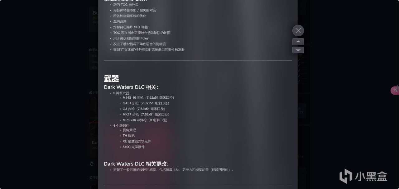 伴随着这次DLC的更新,制作组也更新了一些枪械,这些枪械没有DLC的玩家也可以免费的使用。游戏增加的5把枪械分别为:M14S-16 步枪(7.62x51 毫米口径)、GA51 步枪(7.62x51 毫米口径)、G3 步枪(7.62x51 毫米口径)、MK17 步枪(7.62x51 毫米口径)、MP5SD6 冲锋枪(9 毫米口径)。增加的四个新武器配件分别为:侧角握把、TH 握把、XE 瞄准镜光学元件、510C 光学器件。可以看到这次更新的武器主打一个7.62*51mm配弹的火力拉满的利器,个人较为推荐G3。