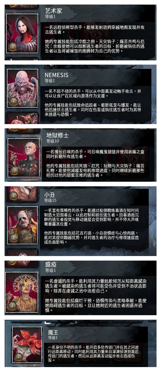 2. 殺手方:藝術家/追擊者/小丑/地獄修士/魔王/瘟疫。