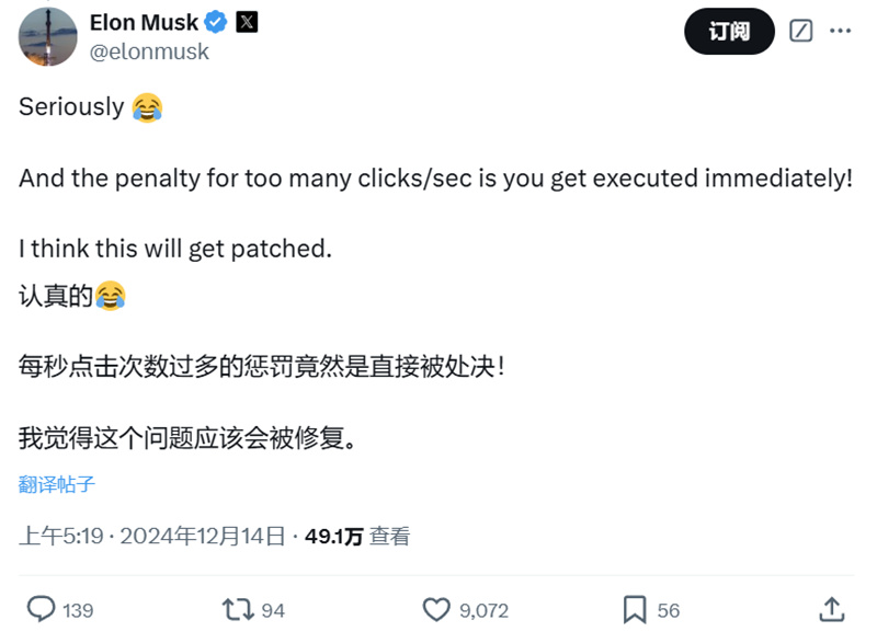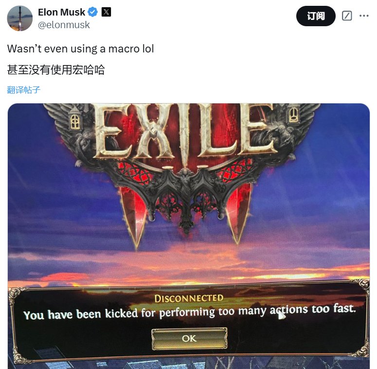 不过就在上周,马斯克遇到了件令他头疼的事——由于他的游戏账号操作过于频繁,《流放之路2》的服务器强行断开了连接,玩不了游戏的马斯克只得在推特上发文调侃道:“我甚至都没用宏,笑死。”