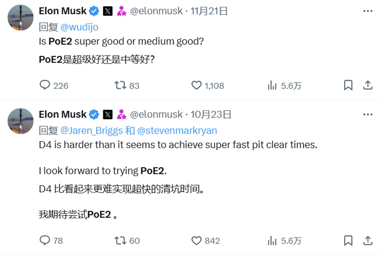 且不论马斯克是否有意营造“喜欢玩游戏”的人设,至少他曾在各种公开场合毫不掩饰地谈论自己的游戏品味。比如他认为“《艾尔登法环》是一款外星人制作的不可思议的游戏”,他自己也多次直播过《暗黑破坏神4》的深坑挑战。从他此前发布的推文可以看出,早在《流放之路2》发售之前,他就对这款游戏充满了期待。