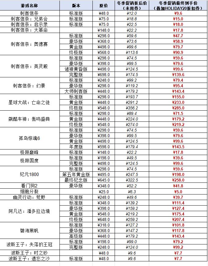 还有多款育碧热门游戏促销中,包含刺客信条,孤岛惊魂,波斯王子系列等等,以下是整理出来的折扣信息,包含各个版本,可以根据需要买买买!以下没有列出的折扣可以通过传送门去商城自行搜索购买👇🏻