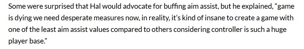 很多玩家對 ImperialHal 的增強瞄準輔助建議感到驚訝,但他表示,“遊戲正在走向死亡,我們現在需要採取緊急措施!考慮到《Apex 英雄》手柄玩家的羣體如此龐大,在遊戲中調低瞄準輔助是非常不理智的!”
