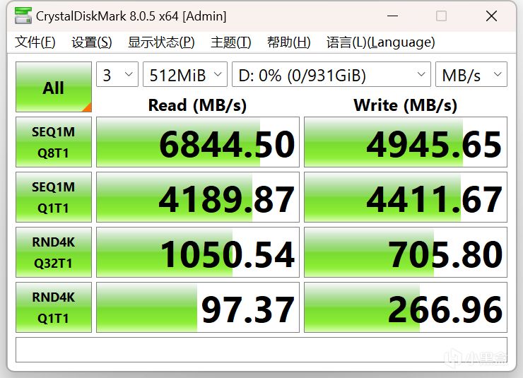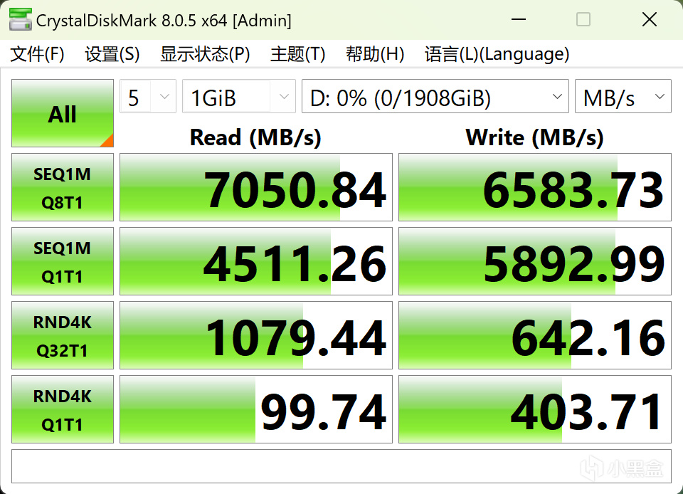 intel平臺讀寫實測最高約7050.848MB/s和6583.73MB/s,AMD可能會更高一些。而且單線程4K隨機讀取寫入速度分別是99.74MB/s和403.71MB/s,這個數據是我測過的PCIe4.0固態硬盤裏的頂級水準!