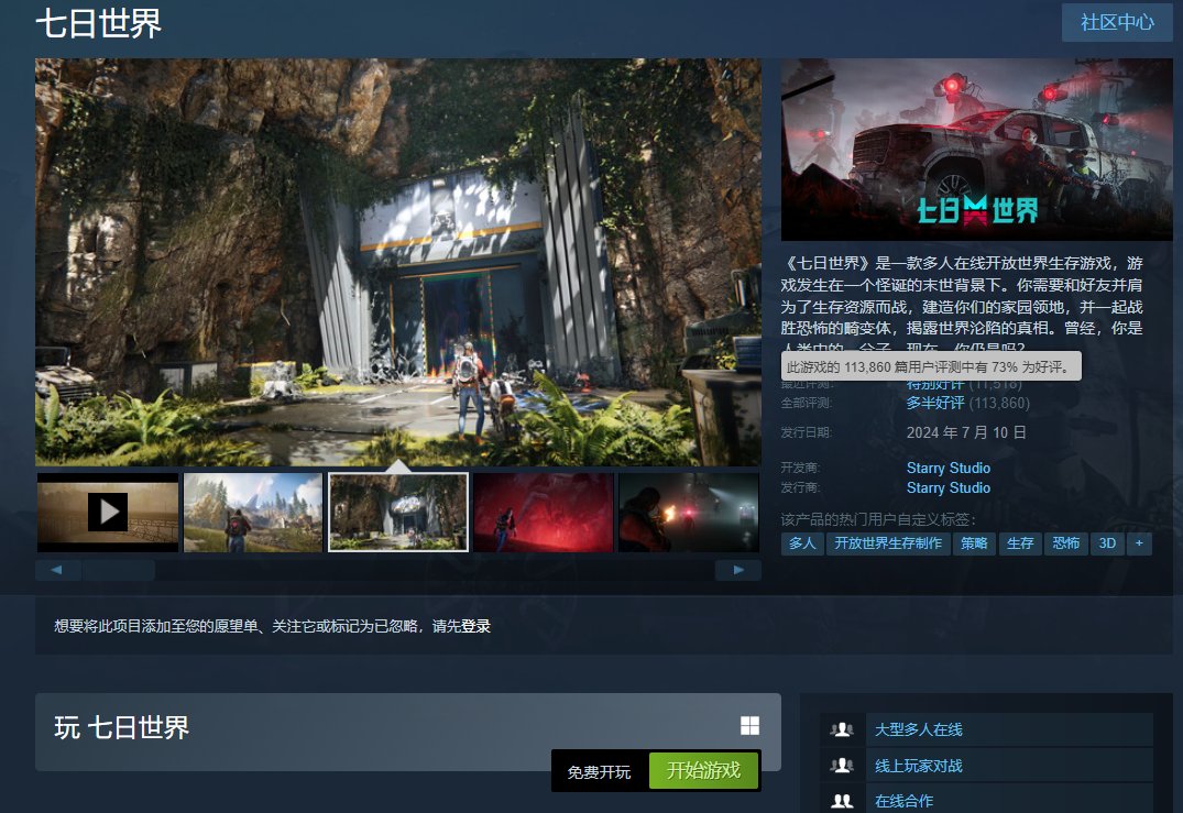 该作于7月10日上线Steam平台,累计收到了11.3w条玩家评论,好评率73%,总评“多半好评”。
