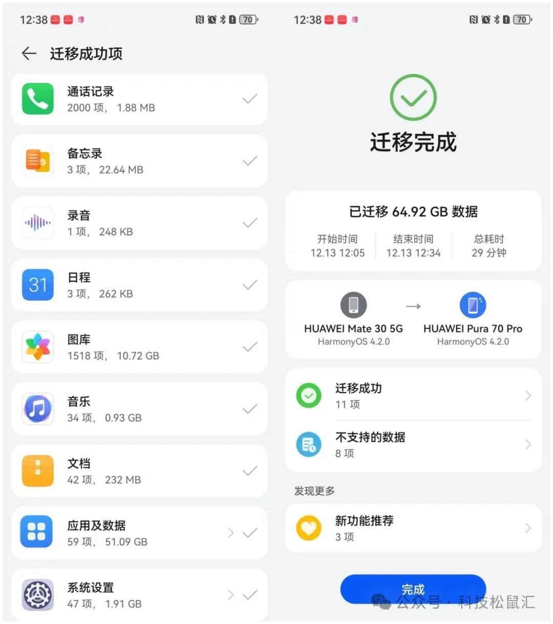 性能方面,Pura70Pro強太多,麒麟9010對比麒麟990 5G還是要強不少的,對於不玩遊戲的我來說,用3-5年沒啥問題。華爲Pura70Pro出廠預裝的鴻蒙4.0,到手後升級了鴻蒙4.2,使用起來確實比mate30更流暢,從mate30遷移資料過來也很快,65G的資料,29分鐘完成,同品牌換機確實很方便。