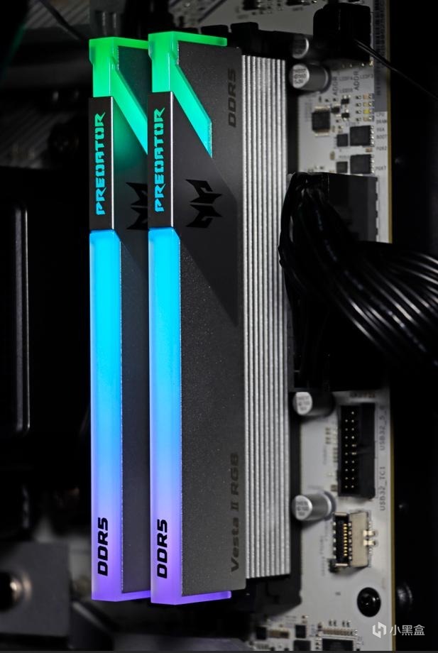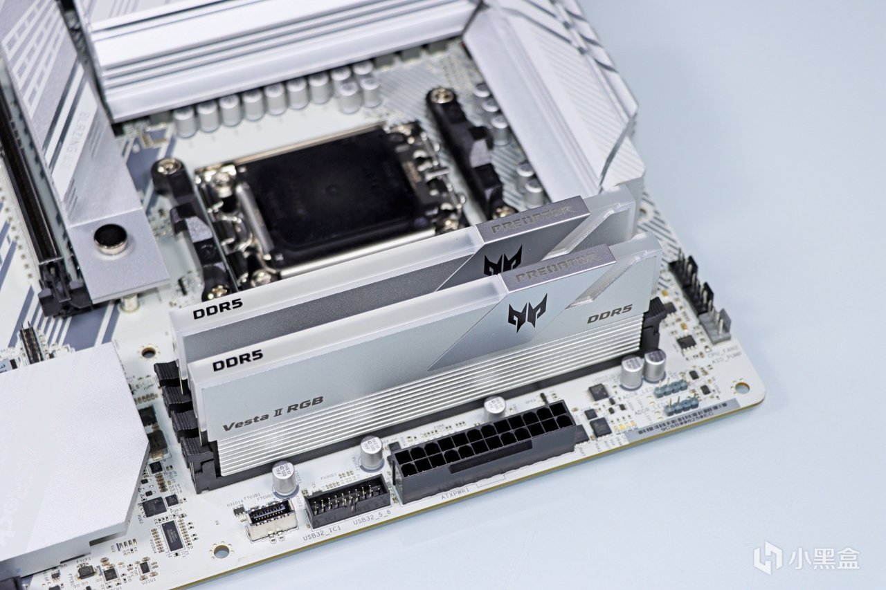 ▲ 把宏碁掠奪者 Vesta II 炫光星艦 RGB燈條 星光銀 DDR5 6000 16G*2 C28安裝到主板上,準備上機實測。