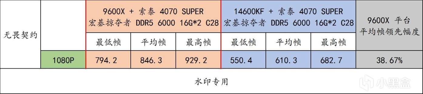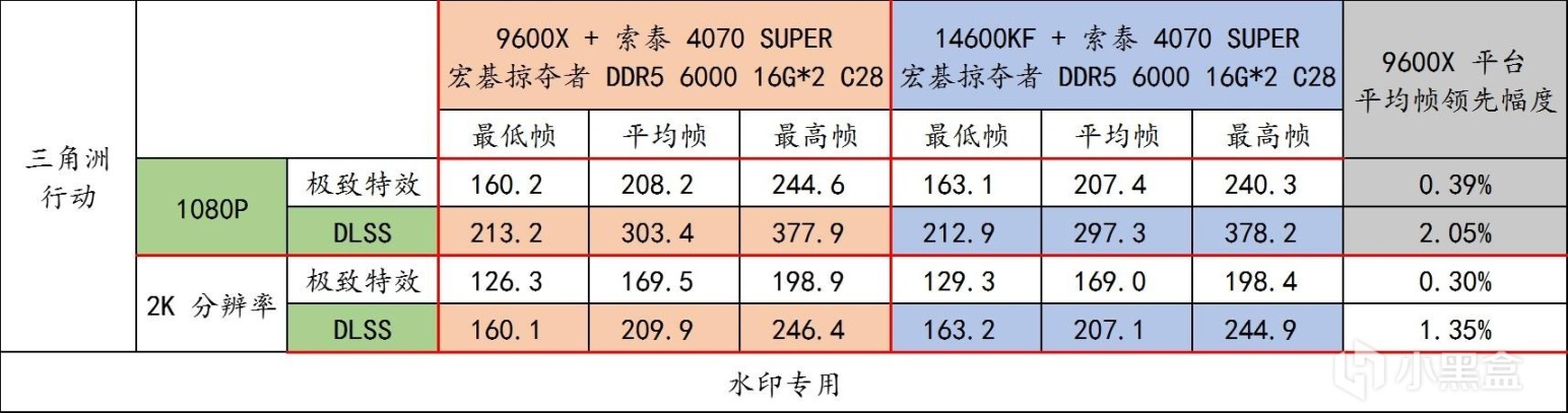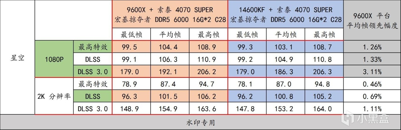 9600X 與 14600KF 雖然沒有像 9800X3D 與 14900K 差距那麼誇張,但是這無礙於 9600X 平臺 + DDR5 6000 C28 在這個遊戲裏全方位勝出,開啓 DLSS 3.0 之後,遊戲的幀率差距會被拉大。