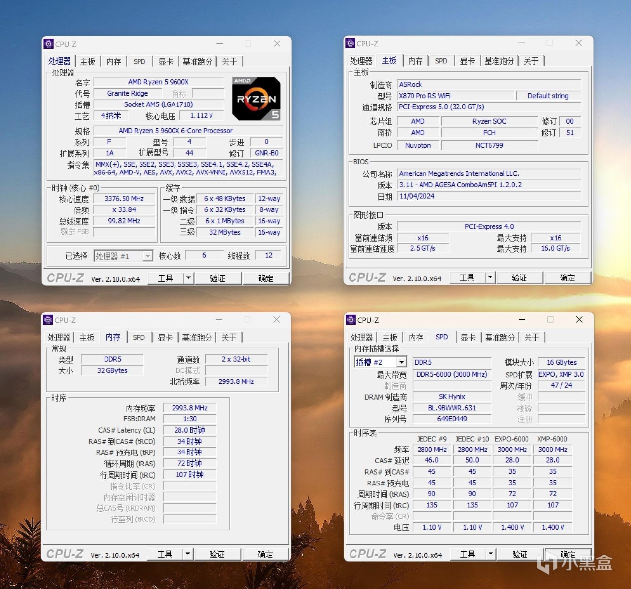 ▲ 每條內存上都有銘牌貼紙,上面清晰標註了每一條內存的容量 16GB,單面 PCB 8 顆海力士 A-Die DRAM 顆粒,頻率爲 DDR5 6000 MT/s ,小參數爲 28-35-35-72 十分優秀的小參數,簡直是爲 9800X3D 爲代表的銳龍 9000 系列而生。