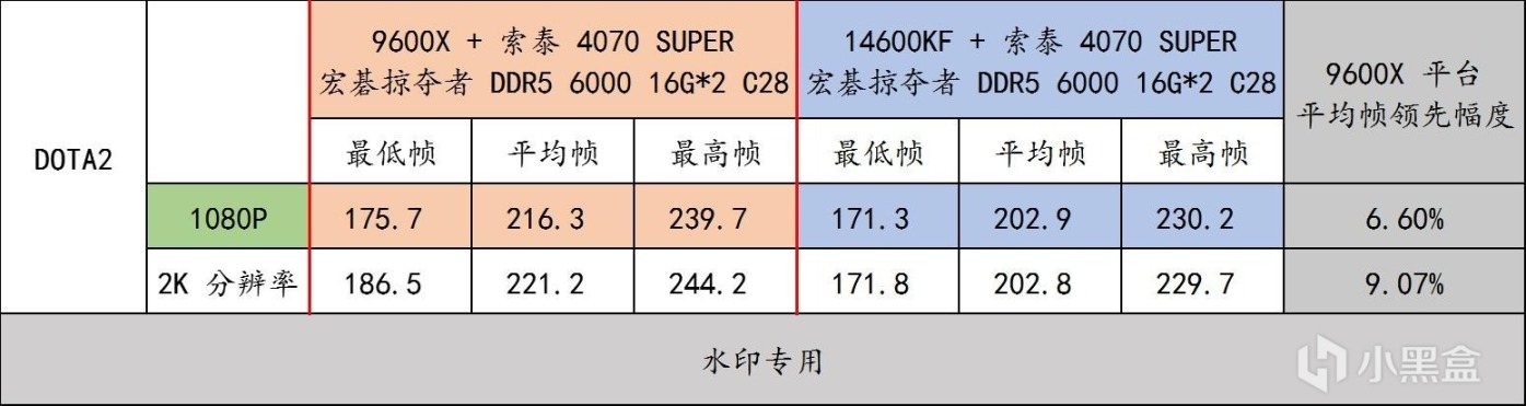 ▲ 《DOTA 2》對於銳龍 9000 系列來說,有個十分特別的地方,就是在顯卡性能足夠的情況下, 2K 與 4K 分辨率下,遊戲的幀率反而比 1080P 還高,無論是之前測試的 9800X3D 還是這次的 9600X 都是一樣的情況。