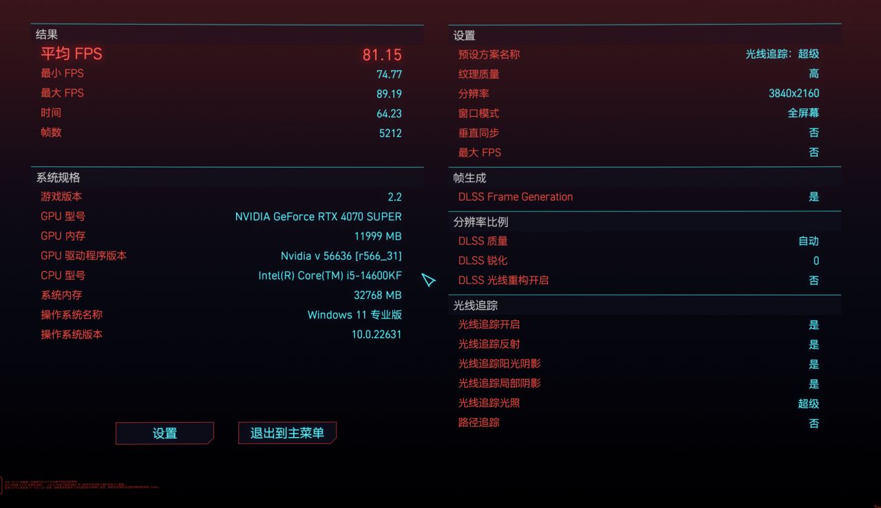比如硬件殺手《賽博朋克 2077》,4K超級光追預設下,跑基準測試: