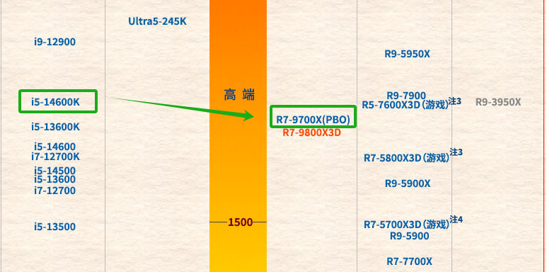 從多核生產力性能天梯圖上看,14600KF對標的CPU是R7 9700X: