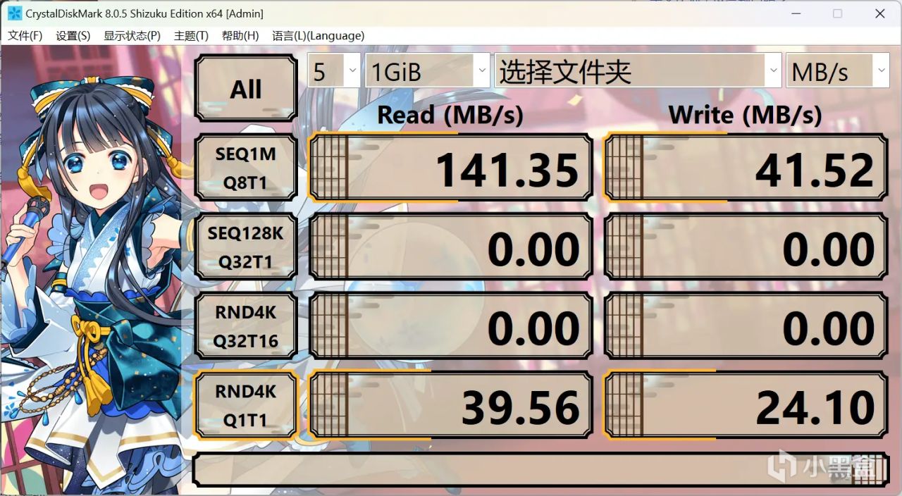 ▼使用CrystalDiskMask進行測試,最終得到順序讀取速度141.35MB/s,寫入速度41.52MB/s,4K讀取速度39.56MB/s,4K寫入速度24.1MB/s。