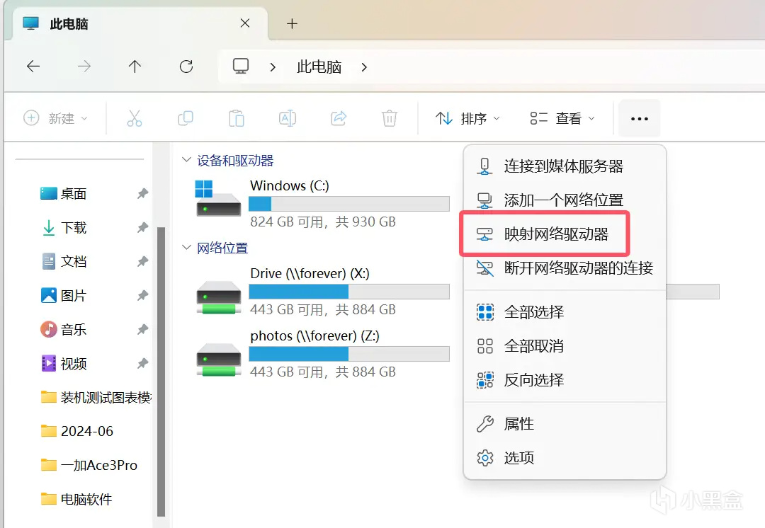 ▼打開此電腦,點擊【···】,找到映射網絡驅動器功能。