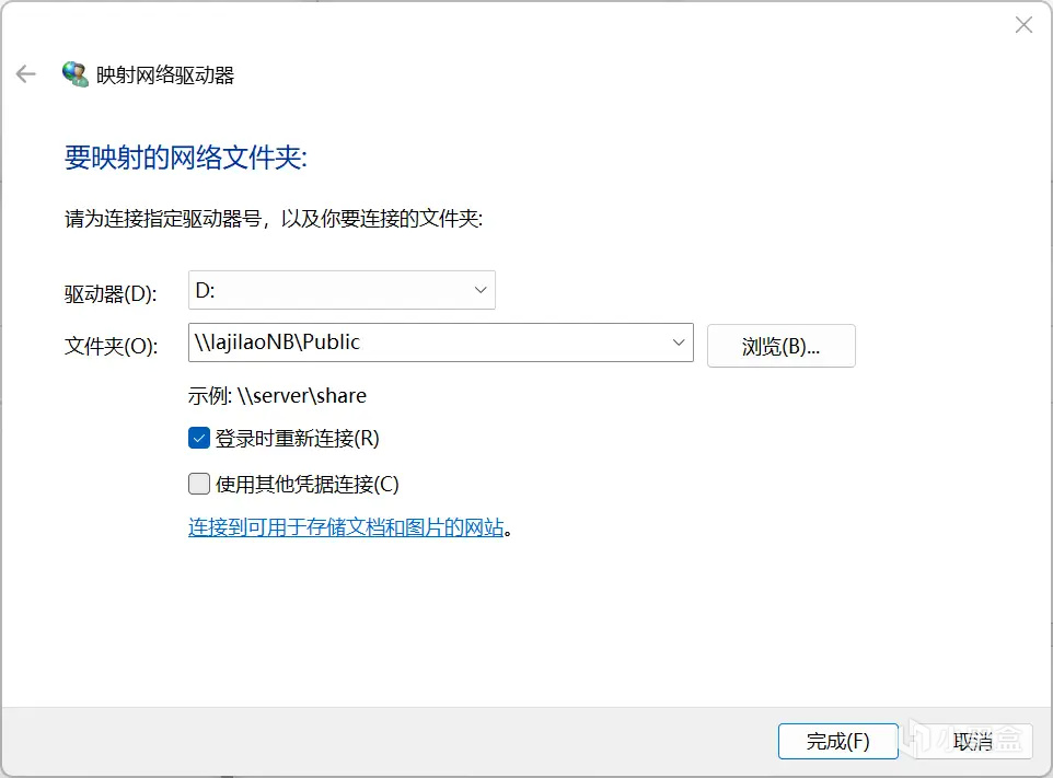▼輸入我們剛剛設置的黑羣暉設備名稱或者IP地址加上共享文件夾名稱,以便登錄,主要\\不要省,按示例填寫。