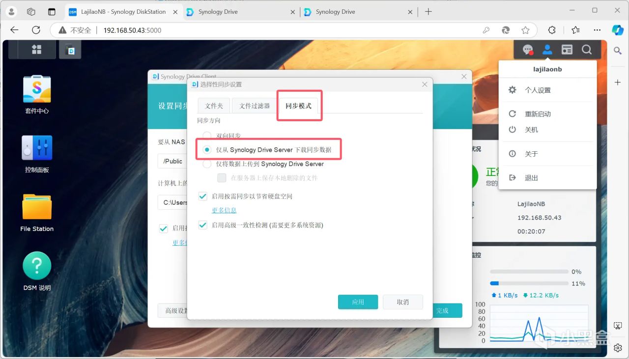 ▼部署PC Drive客戶端的時候,宿主機與虛擬機的功能選擇同步,並在更多設置中將同步模式這是爲僅從Drive Server下載同步數據(單向同步),這樣尤其是自媒體創作者,在將素材上傳的虛擬機NAS中時,他就會無聲的把素材同步到宿主機啦。