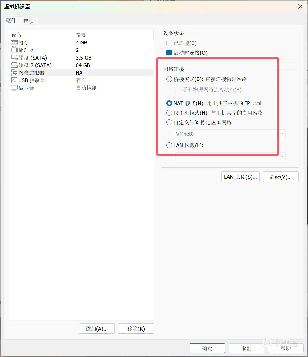 ▼另一個需要設置的項目是網絡適配器,默認情況下使用的NAT模式,共享主機的IP地址,這樣設備不會有一個獨立的IP,我們把網絡連接改爲橋接模式之後就會有一個獨立的IP了。