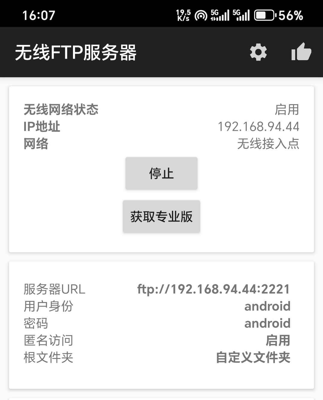 安裝“無線FTP服務器”,連接WIFI或者開啓熱點後就可以直接點擊開啓鍵。