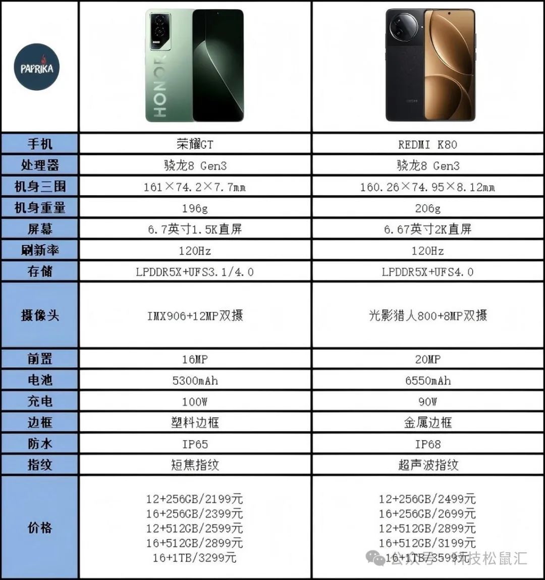 荣耀GT于12月16日正式发布,作为GT独立后的首款机型,荣耀GT给我们带来了哪些惊喜,又有哪些槽点呢?荣耀独立GT就是为了和红米K系列争夺中端游戏手机市场,所以荣耀GT就是冲红米K80而来。荣耀GT售价2199起,对比相同内容的红米K80,荣耀GT便宜300,那么荣耀GT和红米K80到底哪款手机更值得入手呢?