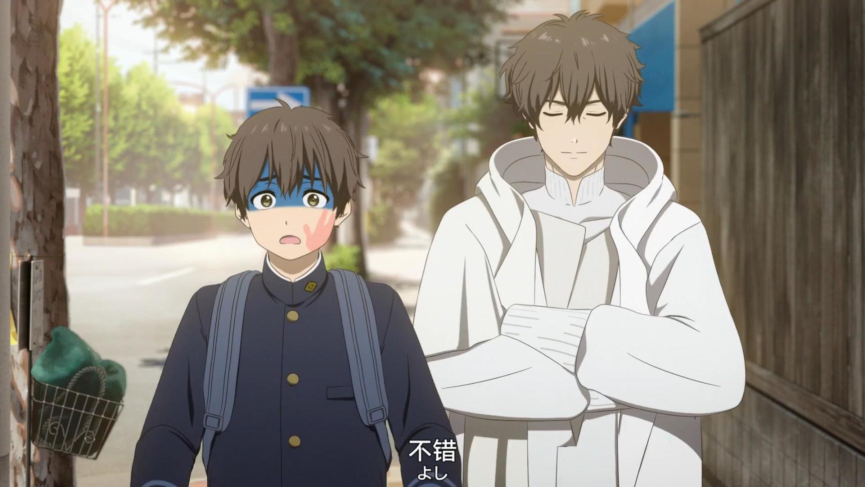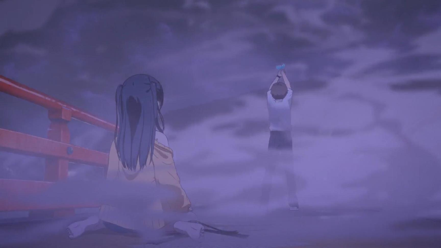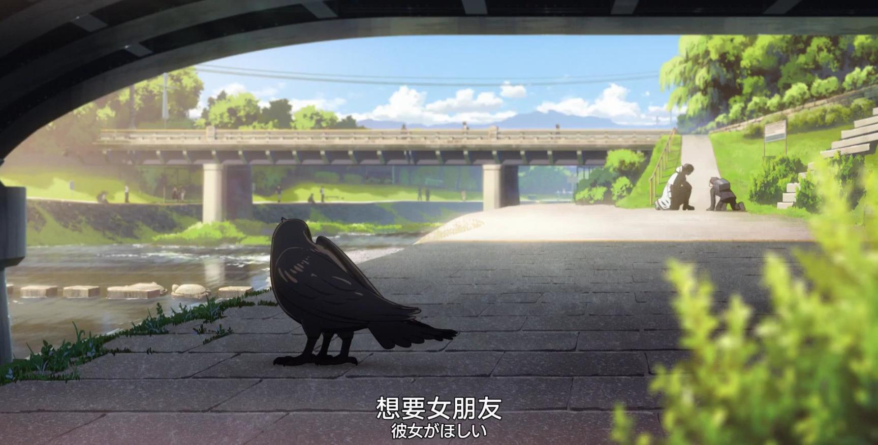 作品对爱情的的刻画其实不算特别多,更多的是发展阶段的故事和两个坚书接触的故事情节,爱情的部分实则是让整部作品走向完美的关键桥段,少而精确,少而重要。而且前面对女主角一行瑠璃的刻画不多,有点看不出一行的内心想法和感情变化,让人感动的反而是在楼梯处一行与成年坚书的拥抱和对话。这里也是值得注意的地方,此时一行身上的书签变成了乌鸦的羽毛,可以理解为是被乌鸦附身的状态,而这只乌鸦是真正现实世界中的一行瑠璃化身而成,所以这一幕一行对成年坚书说的话,实际上是现实中一行想对沉睡着的坚书说的话。