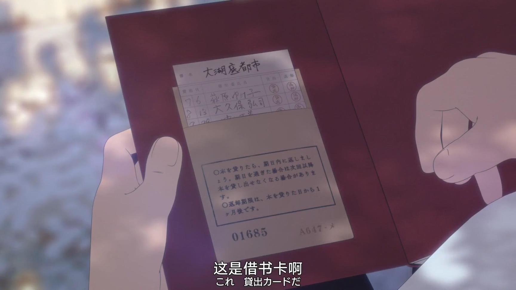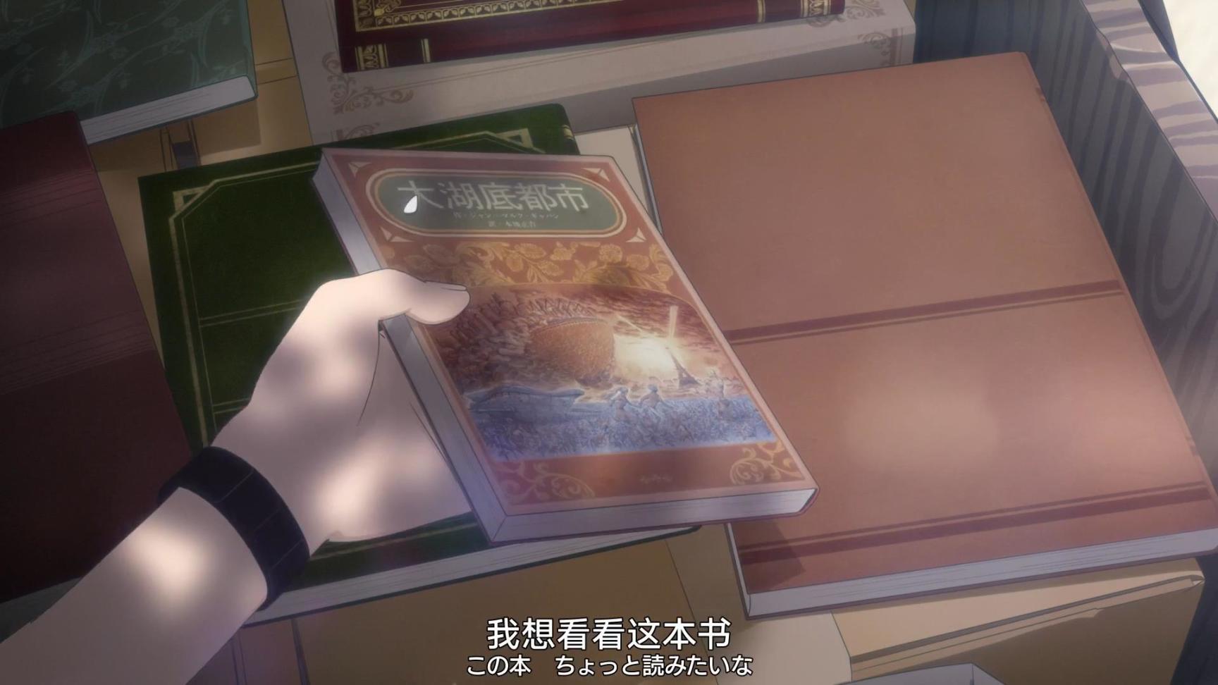 中途的短暂休息时,一行表示自己喜欢冒险类的书籍,特别憧憬主角在经过各种艰难险阻后达成目的英姿,而坚书喜欢的是科幻类小说。两种书籍,冒险与科幻恰好是本部作品的两个标签。两人的互相分享使得彼此之间的距离再一次拉进,坚书看着被风吹拂着的一行的模样,害羞地低头急忙转移话题,拿起小车里一本叫《大湖底都市》的小说翻了翻,想在旧书市场开始后买下来,书籍的封里贴着以前的借书卡,记录着每个看过这本书的人名字。一行看着书籍说到“第一个读它,第一个写上自己的名字,应该会心情非常好吧”(记住这本书,“书”是整部作品的线索,而这本《大湖底都市》更是两人的感情关键,后面会起到非常重要的作用)