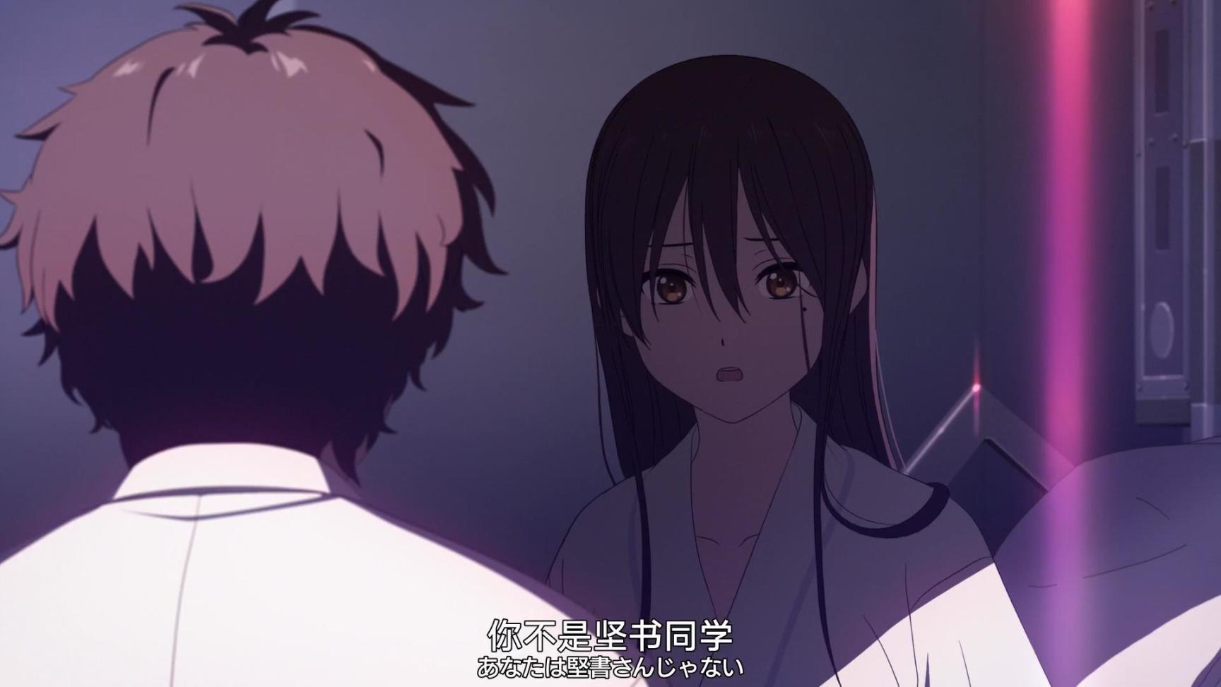 成年坚书将相框中的书签带到了医院给一行,并告诉一行自己这10年来发生的事,一行看着窗户上自己的模样,心中产生了一丝不妥,身旁的成年坚书明明很熟悉却又很陌生,两人逐渐贴近,在嘴唇即将触碰之际,一行开口问了句“那本书......”,而成年坚书停了下来疑惑的问“那本书?”一行马上推开了成年坚书,面前的这个坚书不是自己认识的那个坚书,成年坚书不敢相信地看着一行。(这里说的“那本书”就是我前面说过两人感情很重要的线索《大湖底都市》,坚书说过自己喜欢这本书而且打算买下来,但因为意外被烧毁,之后又被坚书用神之手复原到了一行手中,一行和坚书都知道这本书。但成年坚书的时间线里这本书被烧毁没被复原,所以成年坚书并不知道一行口中说着“那本书”是指什么,一行从而断定眼前这个跟坚书长得一模一样的人不是自己所认识的坚书)
