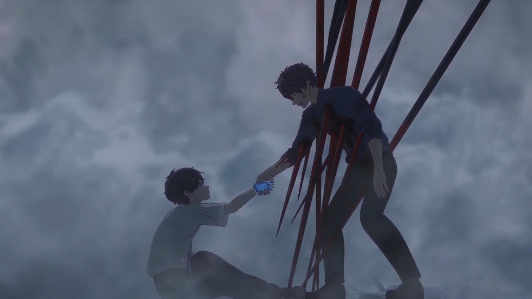 怪物不断给予着坚书压力,身上一道道触手化身成利剑,全部锁定坚书从空中刺下,激起了一片烟尘。坐在地上的是坚书,而坚书面前,一滴滴血顺着利剑滴落,利剑穿透了成年坚书的身体,在刚刚利剑落下的瞬间,是成年坚书用右腿使尽全力站起拉开了坚书,牺牲了自己。