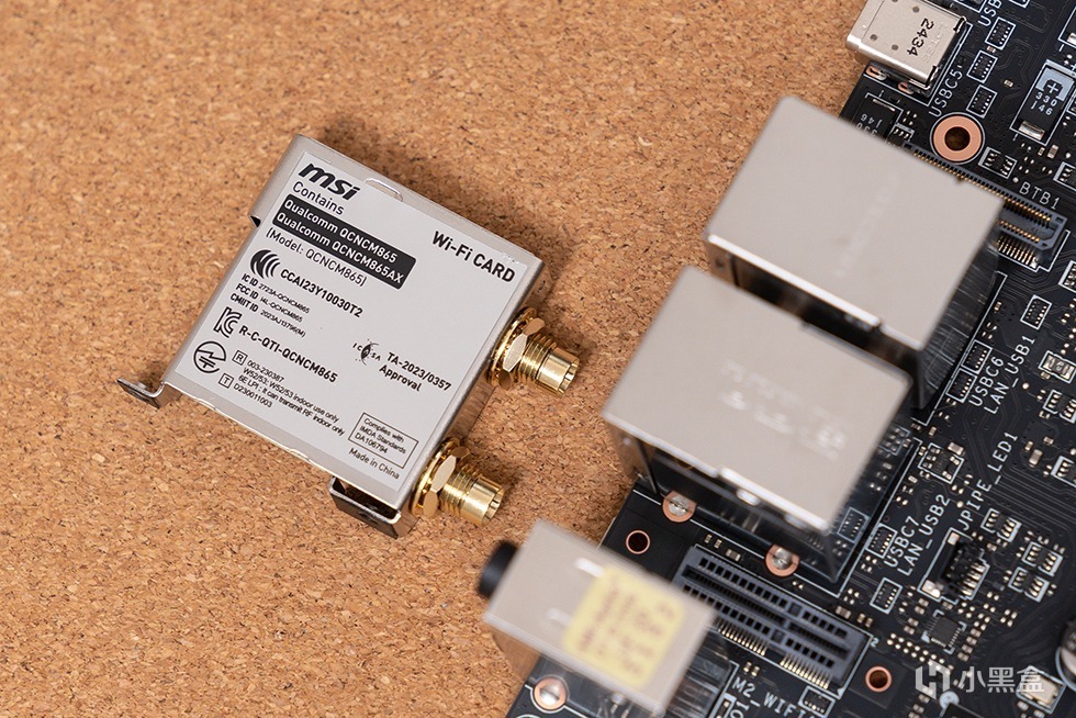 网络方面除了1个 Marvell AQC113CS 10Gbps 和1个 Realtek 8126 5Gbps有线网口以外,还配备了最新的 WIFI 7 无线网卡,来自高通的QCNCM865 芯片,理论峰值速率能达到5.8Gbps,频宽可达320MHz,支持4096-QAM,附件中的WIFI鲨鱼鳍天线采用EZ快插技术,即插即用。
