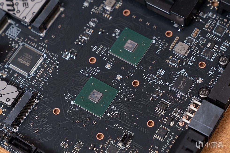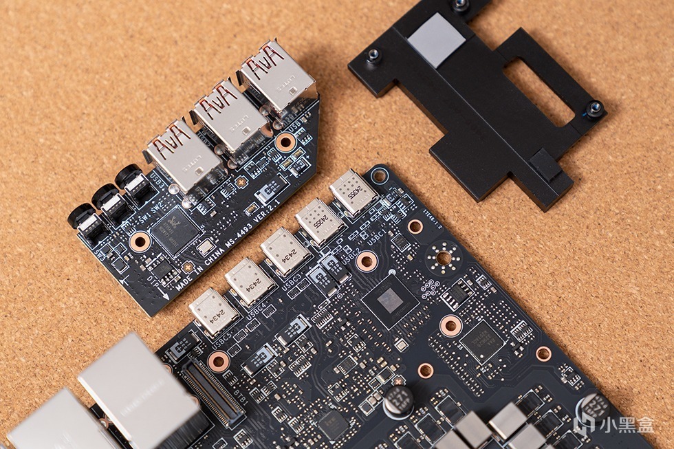 采用了双 USB 4 Type-C 接口设计,拥有USB4和Thunderbolt 4双认证的主控芯片祥硕ASM4242,可提供64Gbps的带宽,可以向后兼容Thunderbolt 3和USB 3.2 Gen2×2等模式。并配备了独立的散热装甲。通过导热垫与CPU散热模块接触,令接口在进行长时间的数据传输时更加稳定高效。上方分离的USB子卡由瑞昱的RTS5420负责USB 3.2 Gen 2 x1控制。