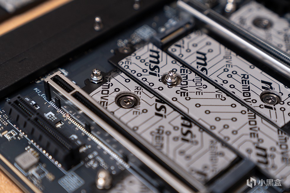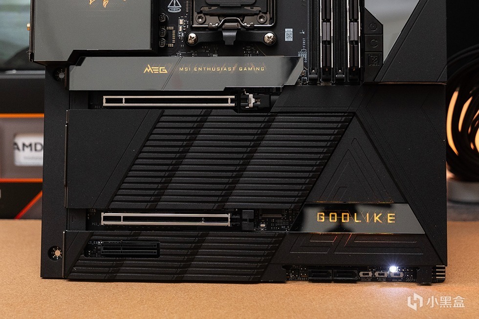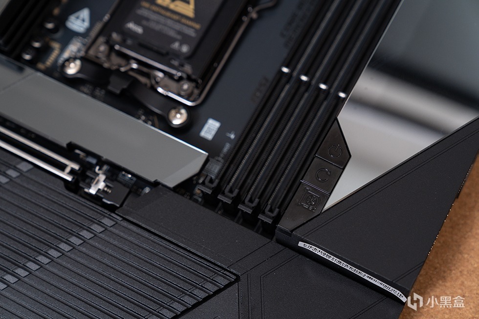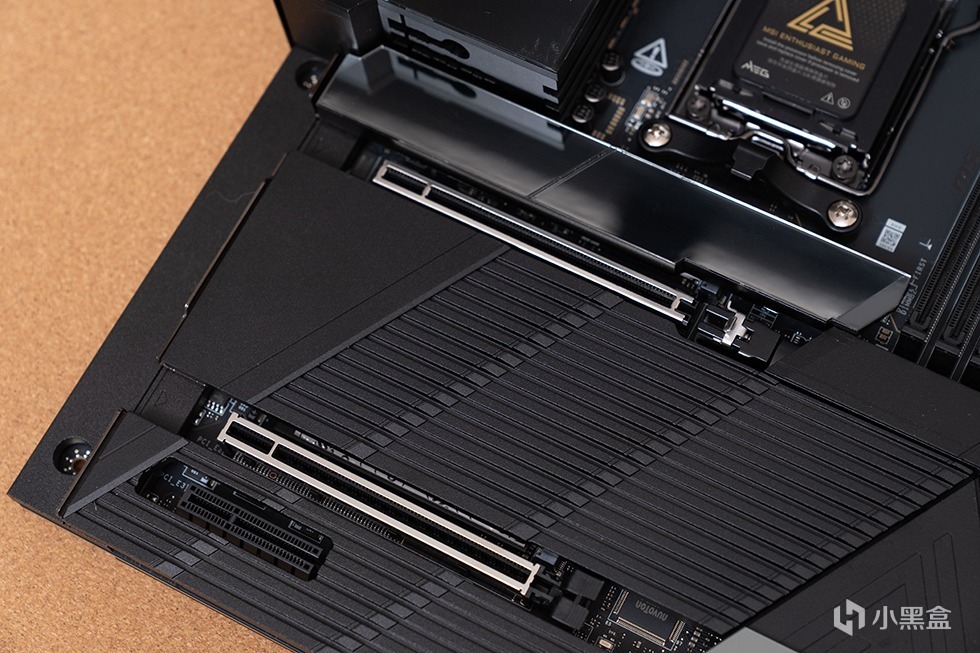 M.2安装位和南桥芯片位大面积散热装甲覆盖,M.2槽位均采用双面M.2 Shield Frozr方案,装甲拆卸十分便捷。其中第一个M.2槽位带有独立的加厚版本的堆叠式散热装甲,保证SSD得到充分散热,从而防止高速/大容量PCI-E 5.0 M.2 SSD出现降速问题。散热装甲最上方还带有镜面LED装饰,通电后会显示MEG LOGO以及MSI ENTHUSIAST GAMING灯光动效。