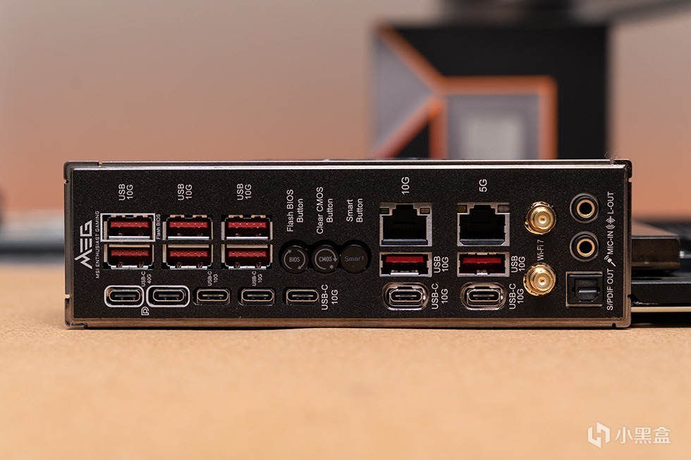 而在背部IO接口上也是顶配标准,提供了2个全功能2个USB4 Type-C(40Gbps,支持视频输出)、5个10Gbps Type-C、8个USB 10Gbps Type-A、1个10G网线接口、1个5G网线接口、WiFi 7天线接口、3.5mm音频口、光纤数字音频接口、重置CMOS按键、BIOS更新按键和智能按键。